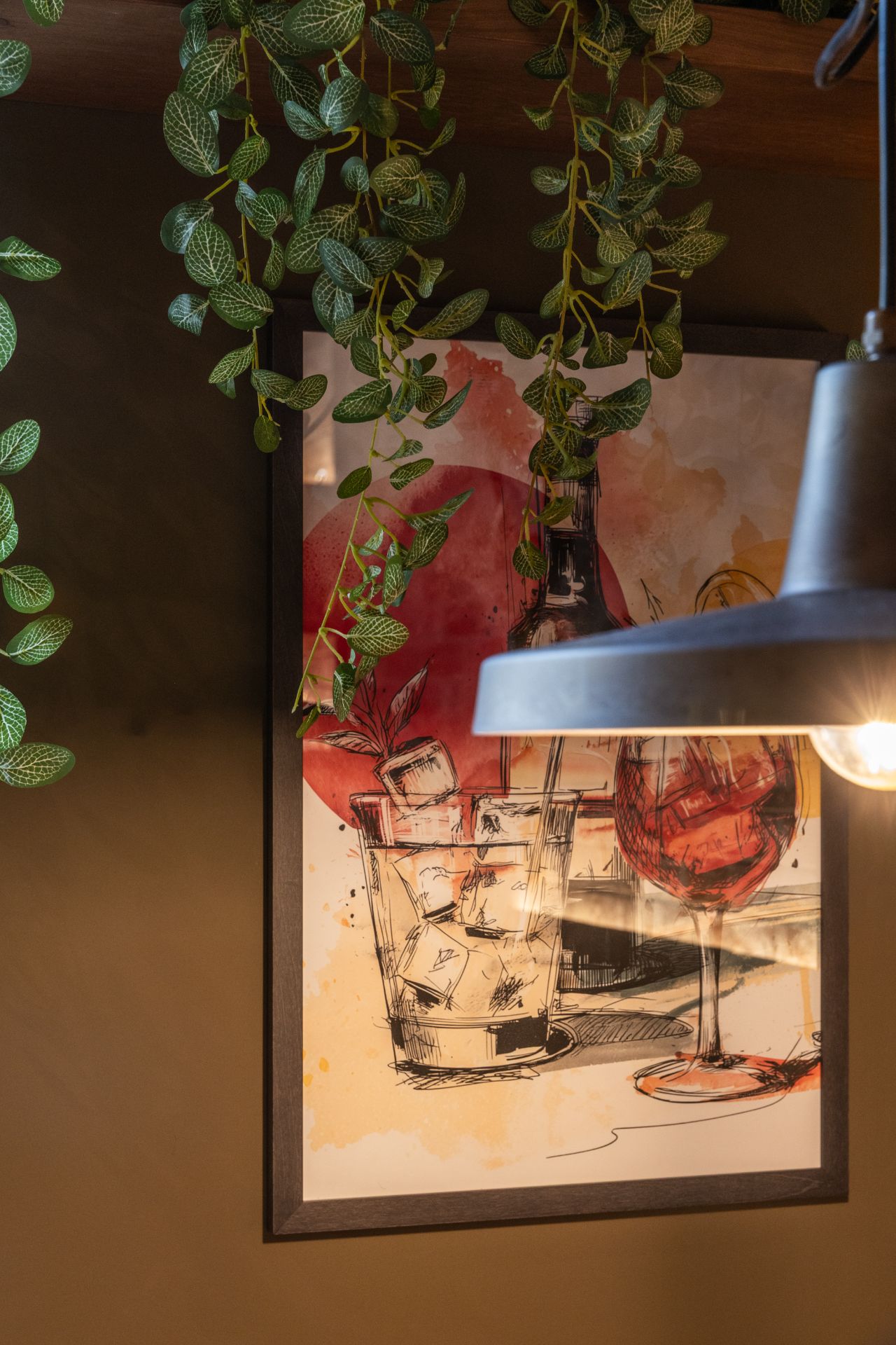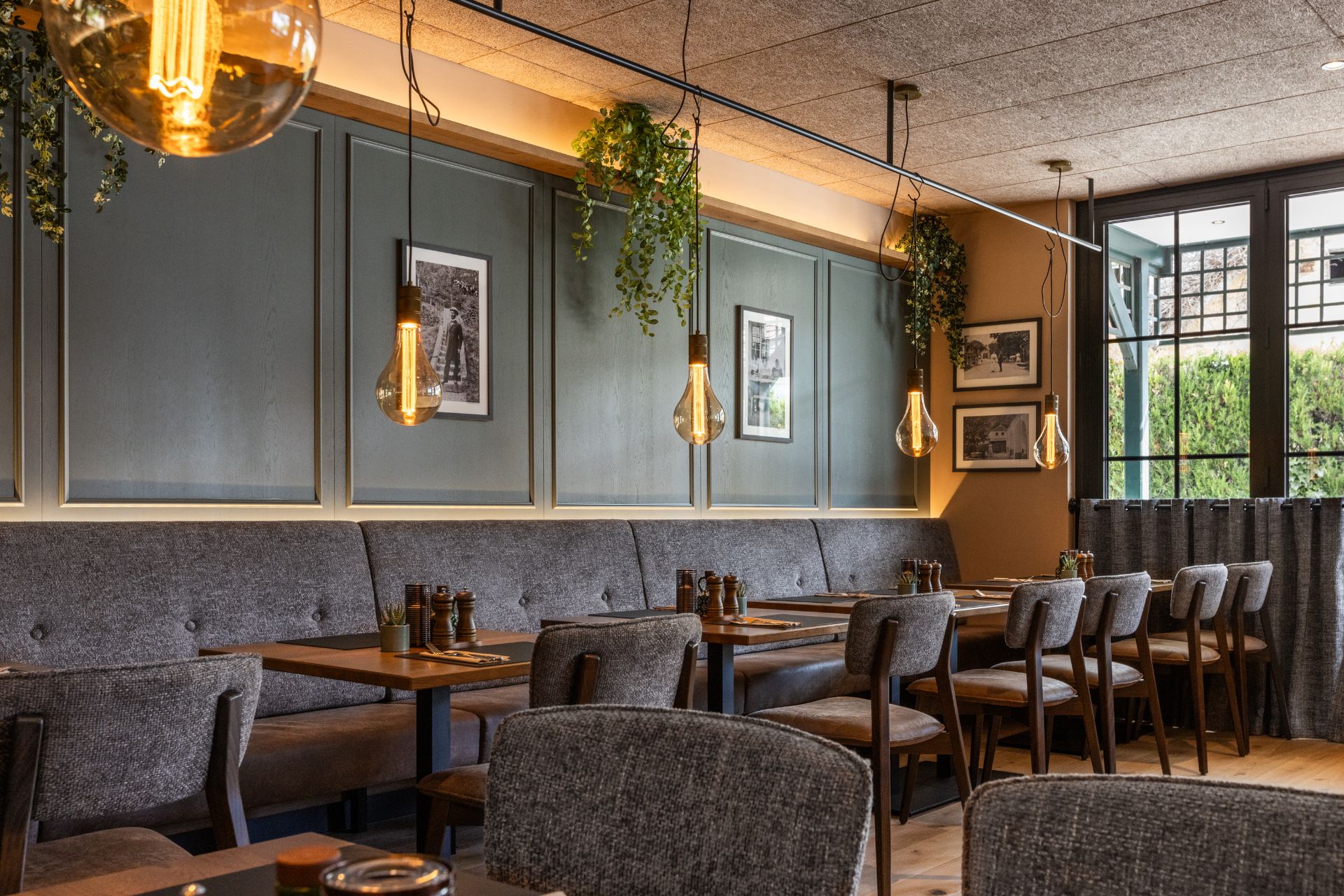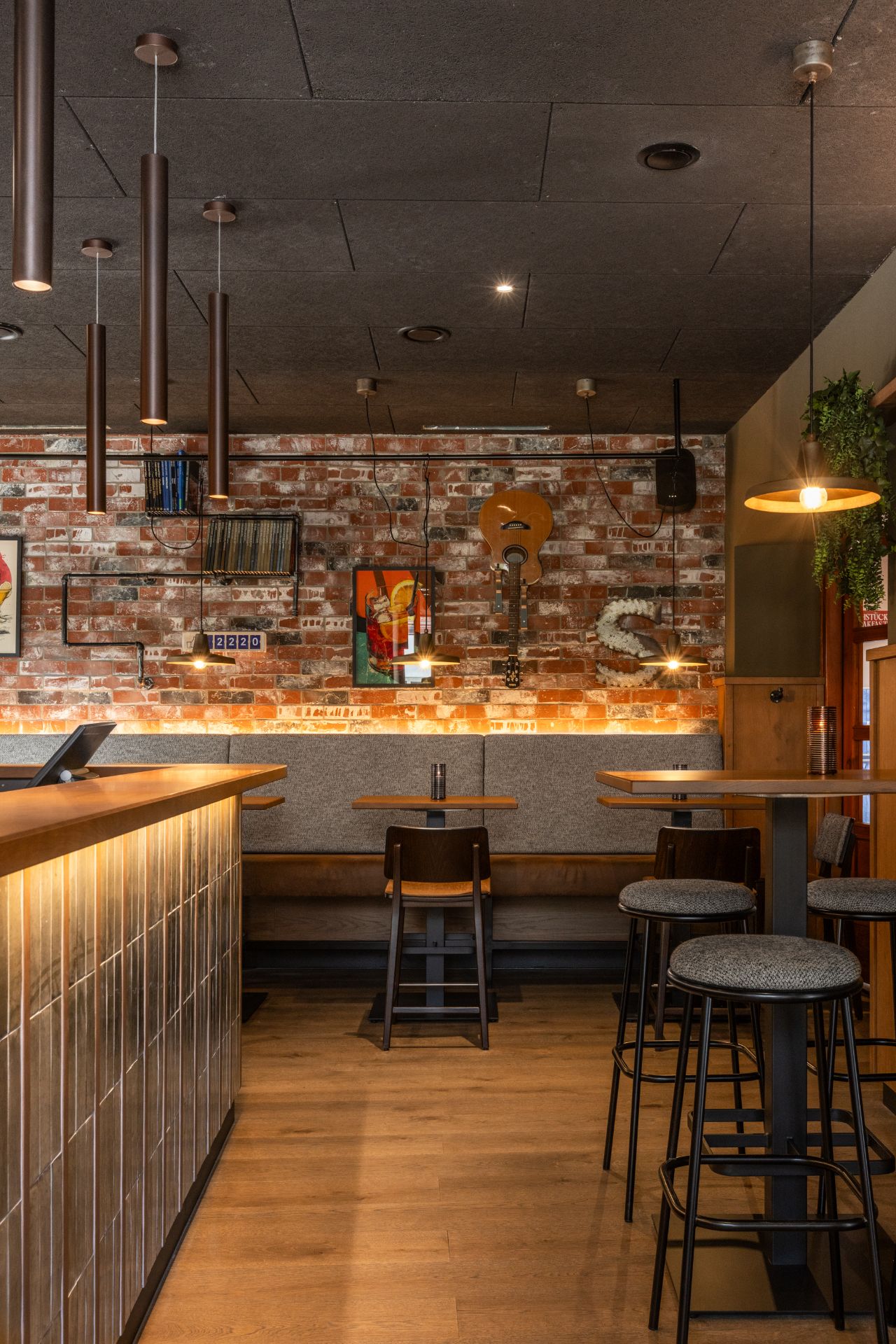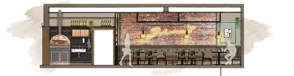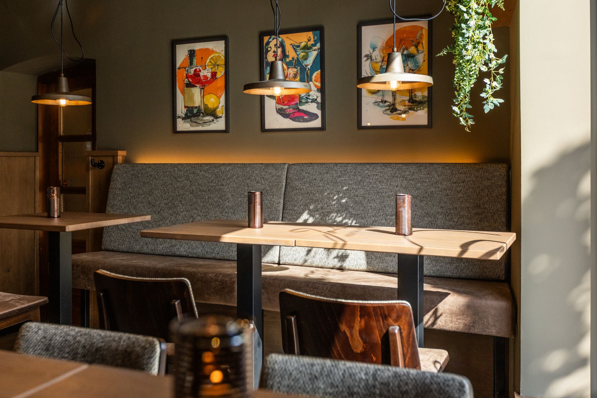 Flexible seating arrangements – from high tables and upholstered benches to large communal tables – allow for maximum versatility. Green wall panels, decorative plant islands, and bold graphic artwork inject modern accents throughout the space. The new brand identity appears subtly yet confidently: the neon "Johann’s" sign on an exposed brick wall becomes a visual statement.