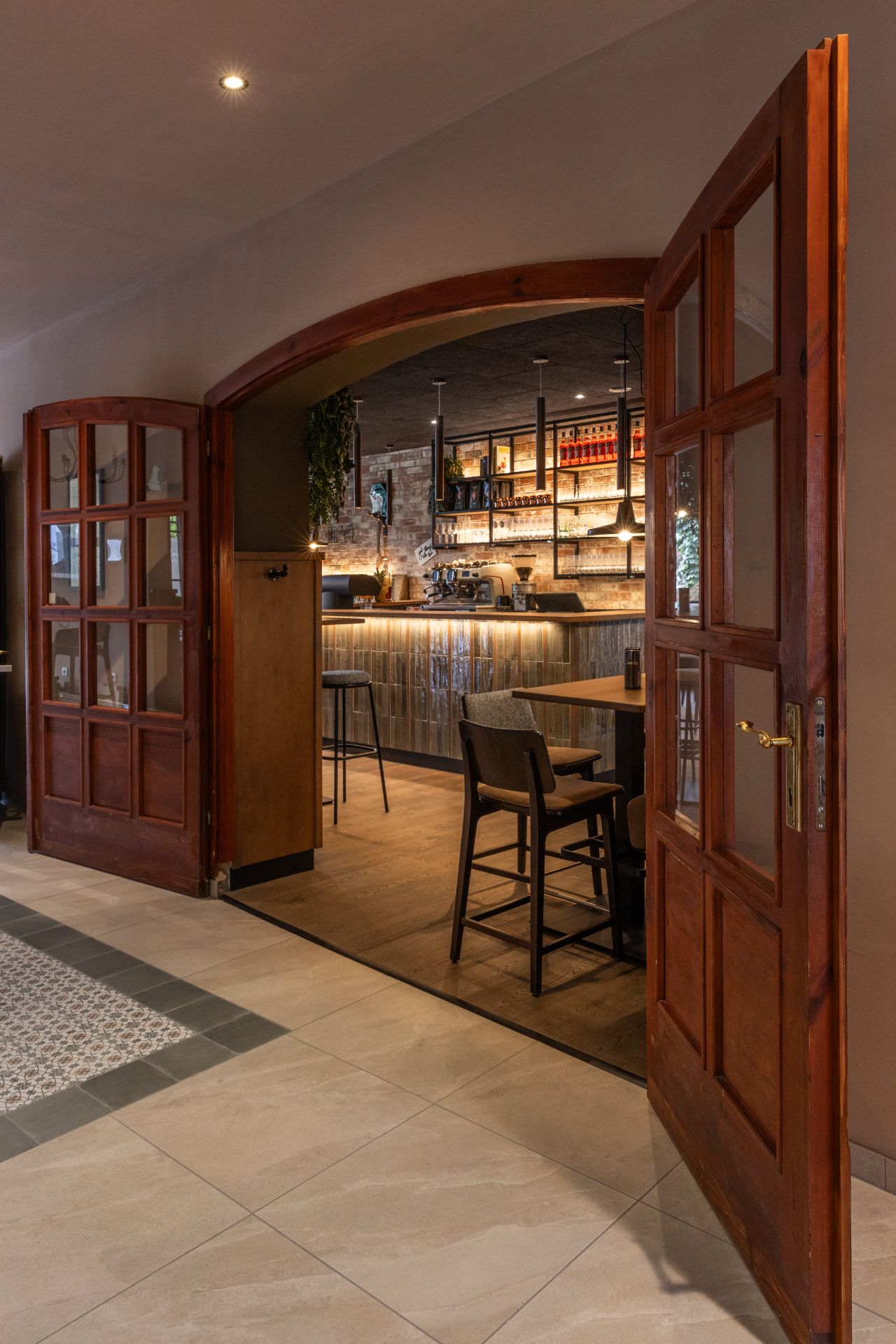 Exposed brick walls, wooden paneling, and dark acoustic ceilings create warmth and character. Delicate pendant lights and clear spatial zoning organize the expansive dining area. A long bar with glossy green-glazed tile cladding and backlit shelving invites guests to enjoy an aperitivo or quick espresso in a relaxed bar atmosphere.