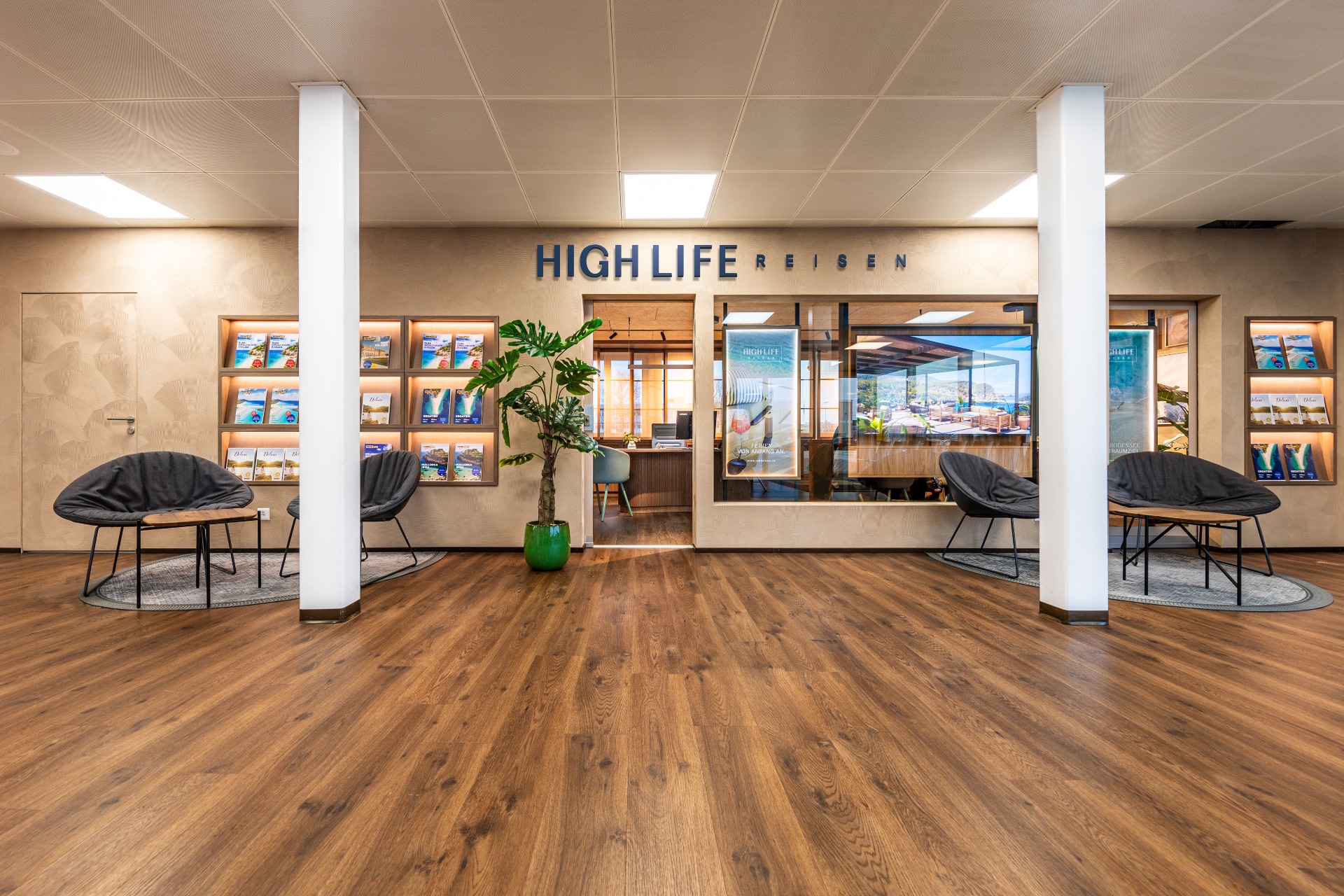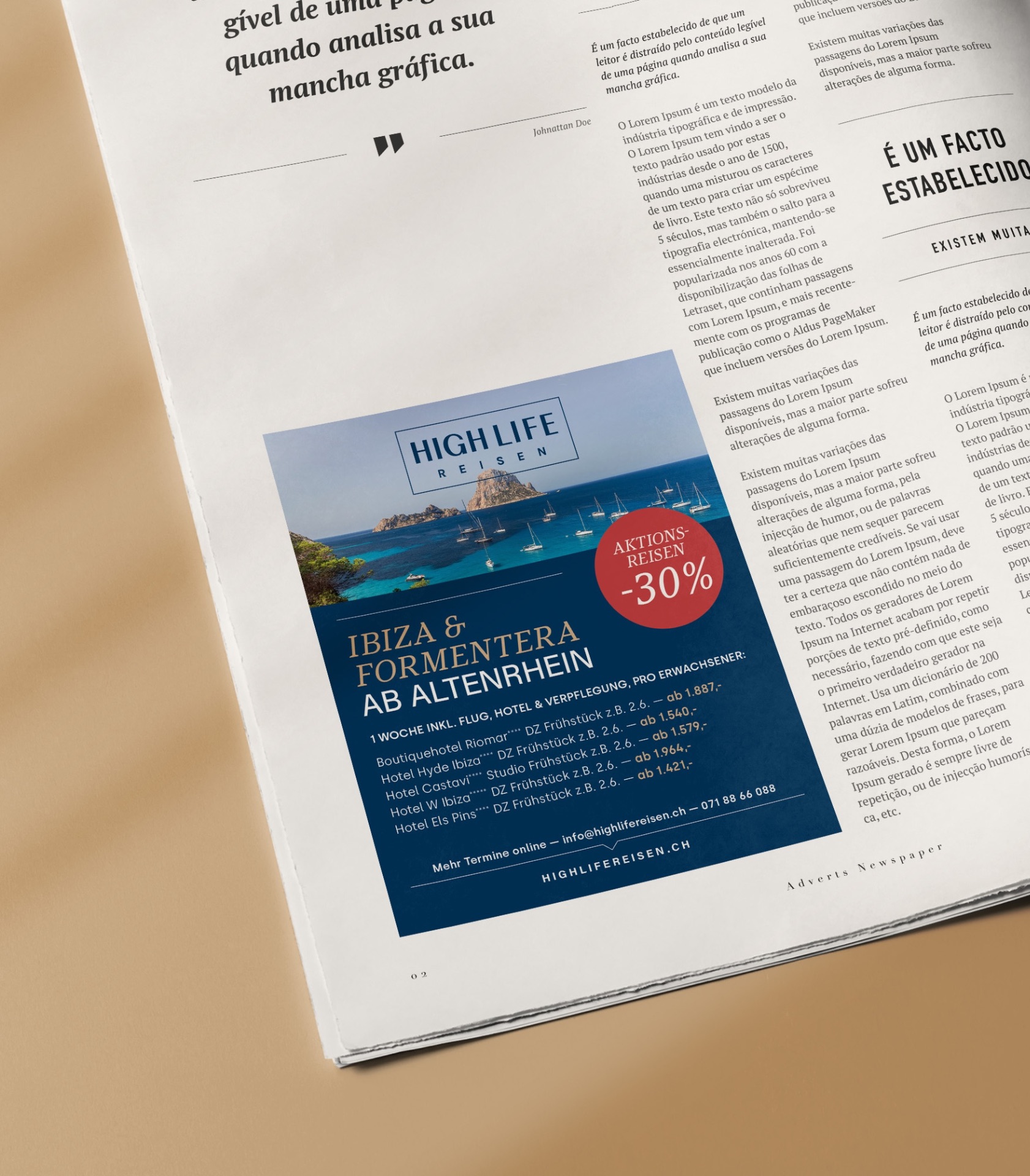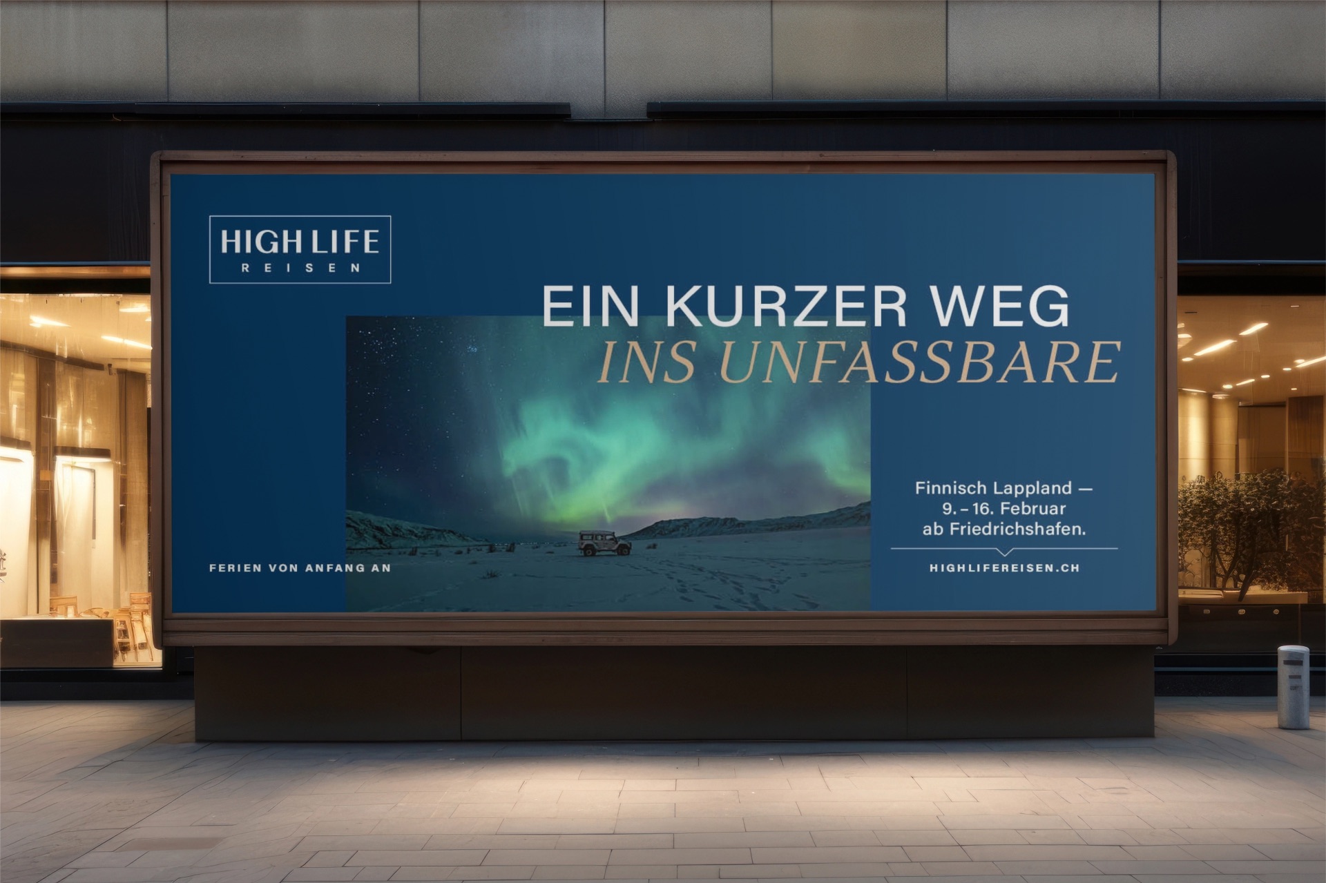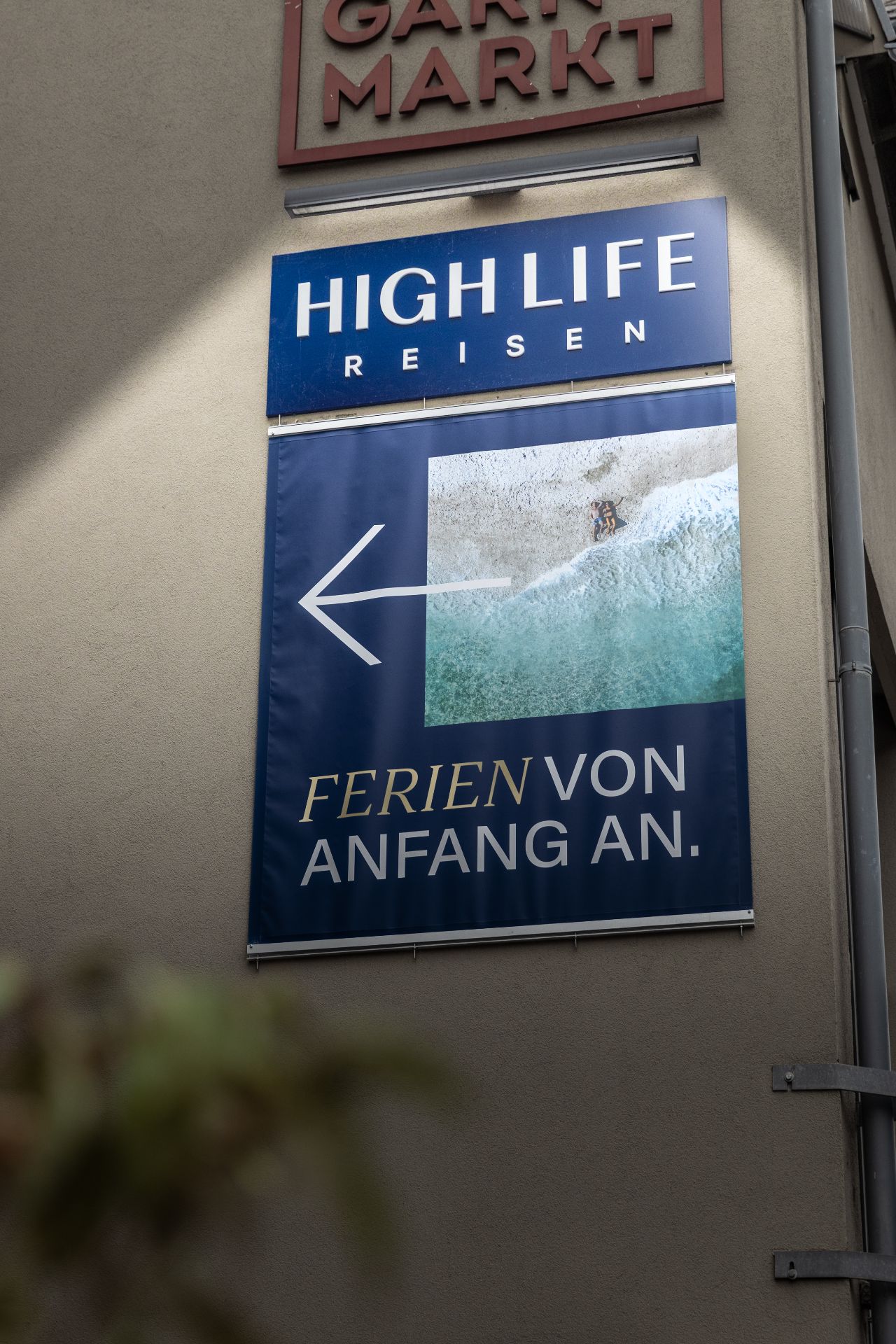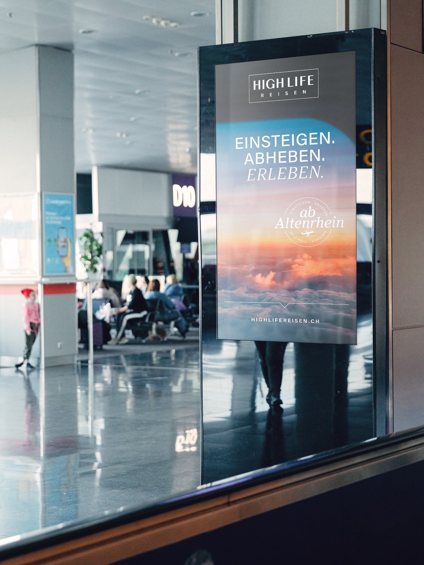 The result is a brand identity that seamlessly spans all touchpoints – from ads and catalogs to airport signage, digital interfaces, and retail design. Today, High Life Reisen appears more modern and consistent: a brand that not only promotes destinations, but also meets people at their personal moment of departure.