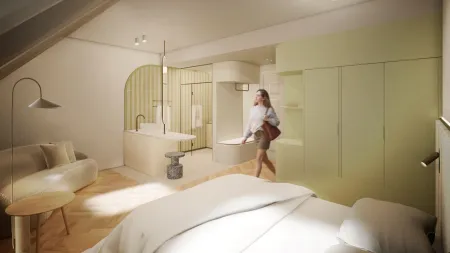 Das von den Derenko Innenarchitekten entwickelte Konzept vereint Kontraste: Historisch trifft auf zeitgenössisch, kantig auf rund. Die zweigeschossige Lobby öffnet sich zum Herzstück des Hauses – dem Stadtgarten. In den rund 40 Zimmern sorgt das Interior-Design durch harmonische Lichtführung und hochwertige Materialien für maximale Geborgenheit. Ein Highlight sind die „Schlafboxen“ im Neubau, die als räumlich gefasste Elemente Schutz und Intimität bieten.