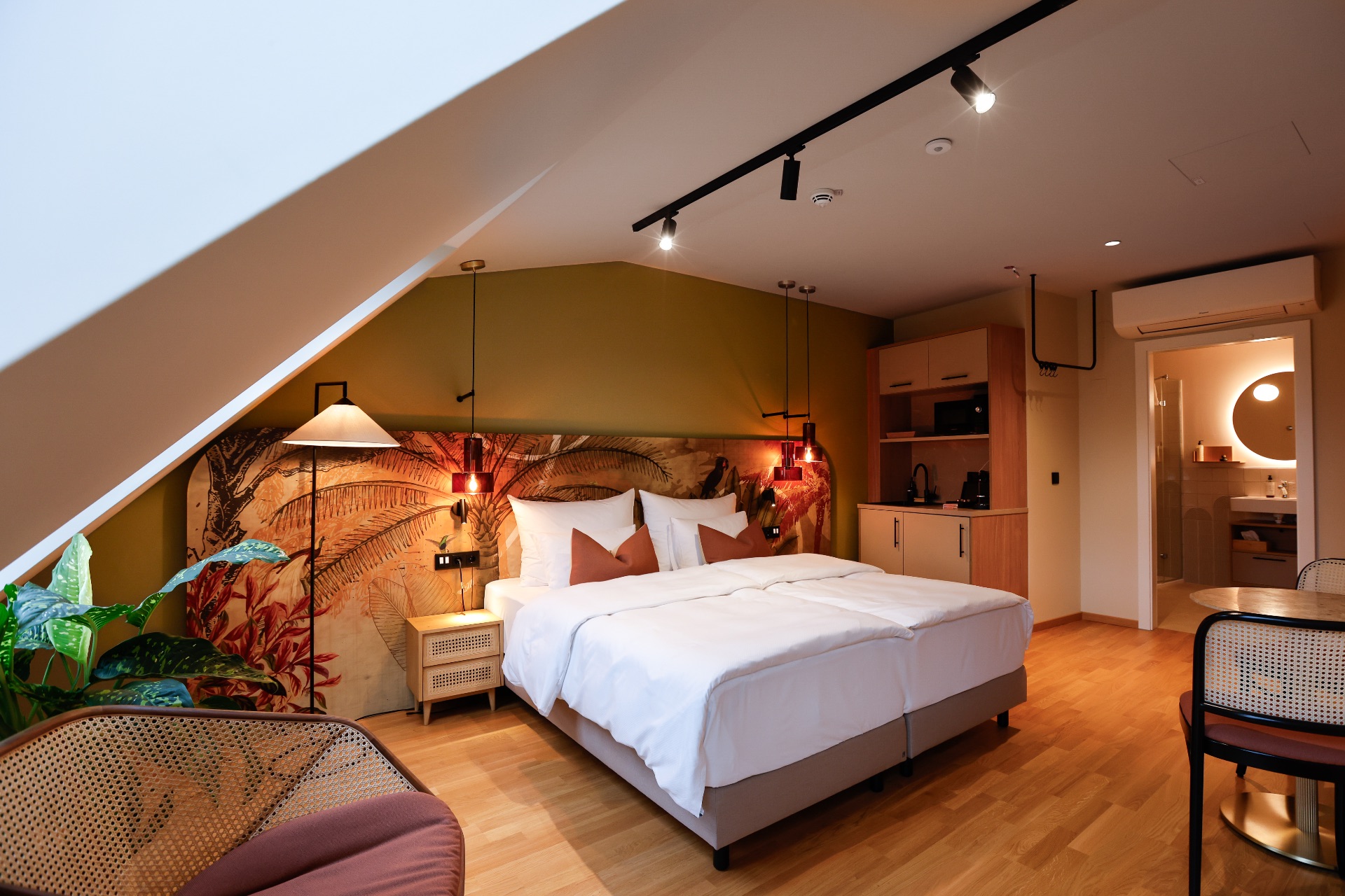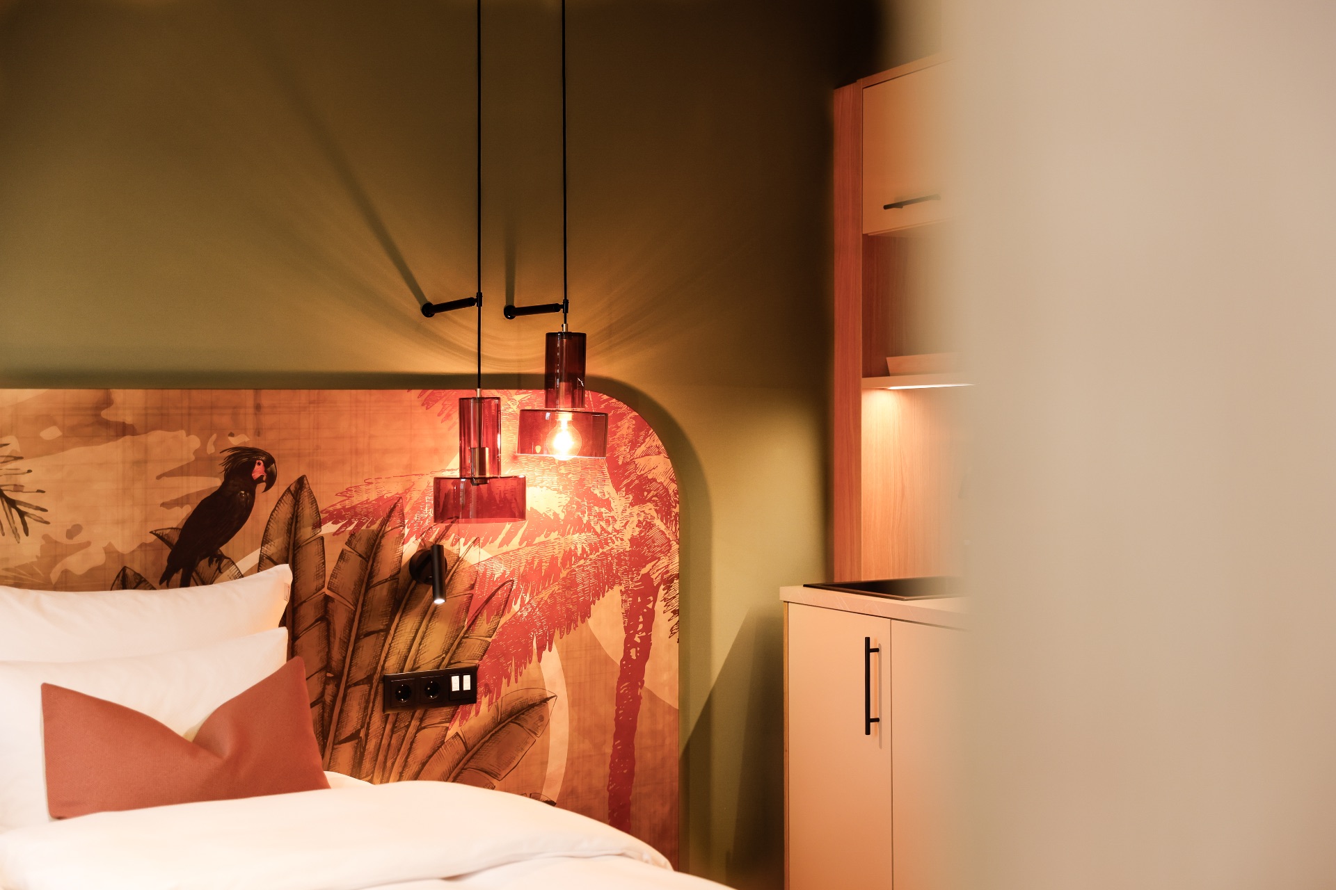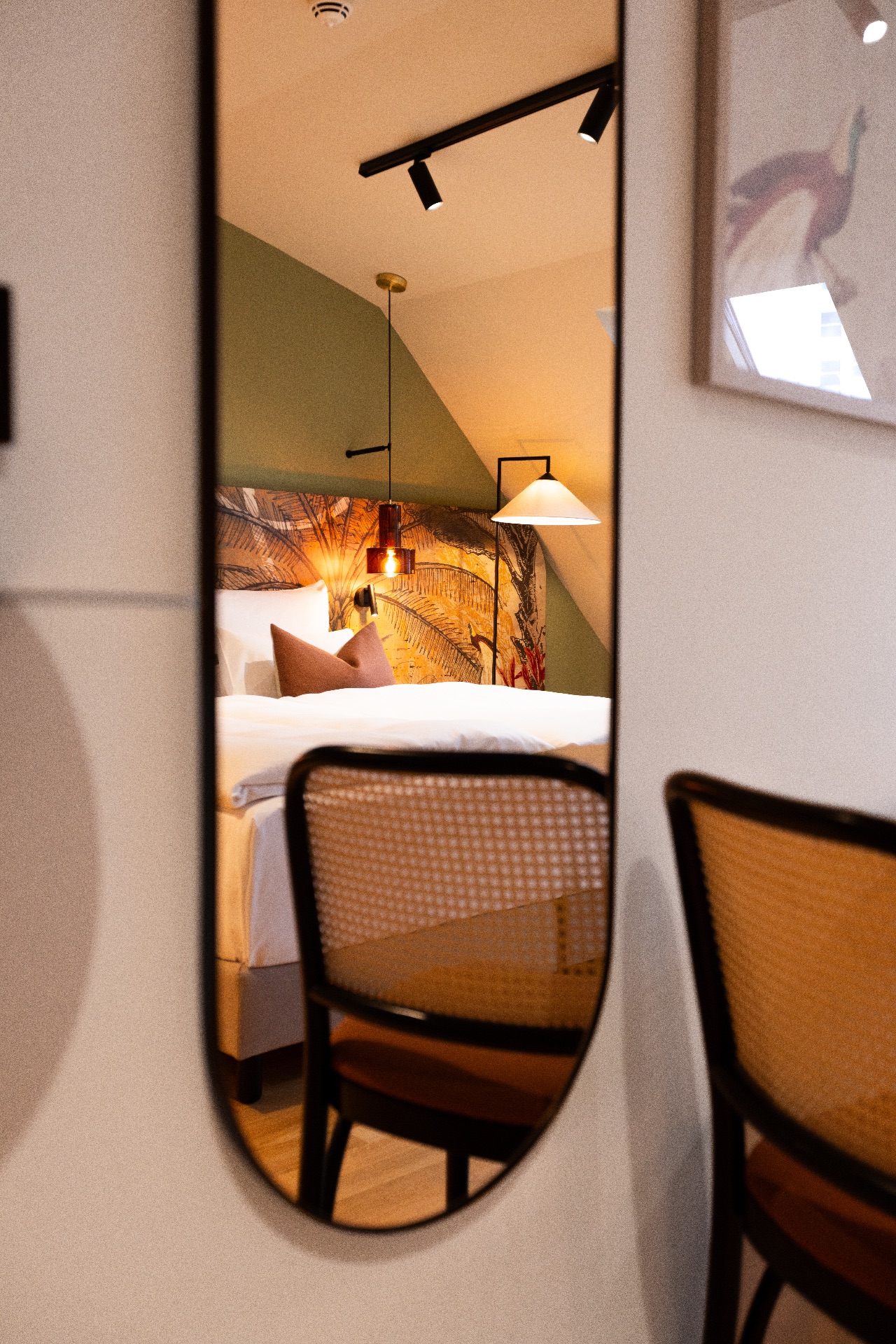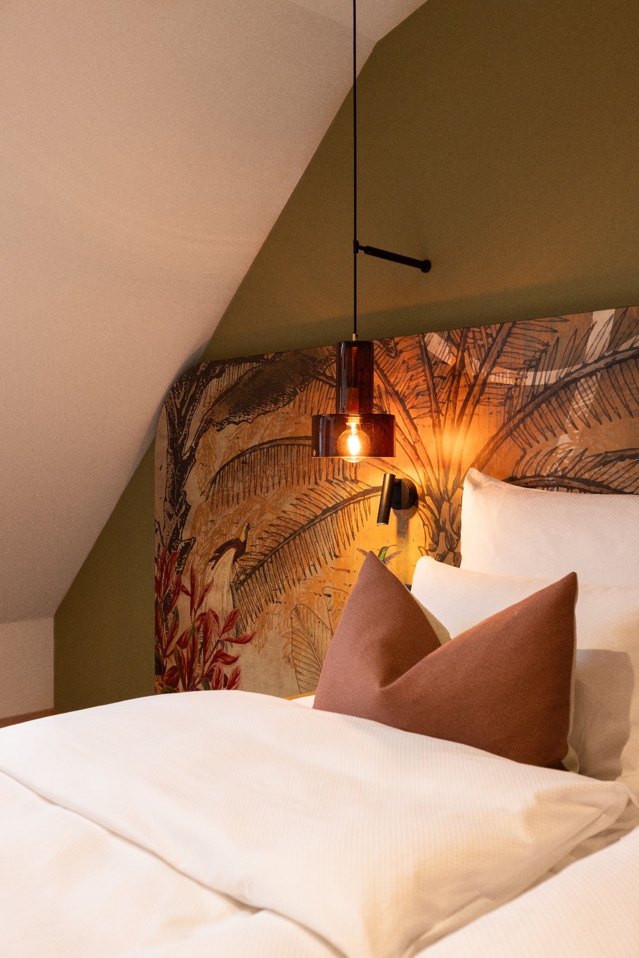 Ein zentrales Gestaltungselement bildet die eigens entwickelte Statement-Tapete hinter den Betten. Die grafisch-illustrative, botanisch inspirierte Gestaltung verleiht den Räumen Tiefe, Atmosphäre und Wiedererkennungswert.