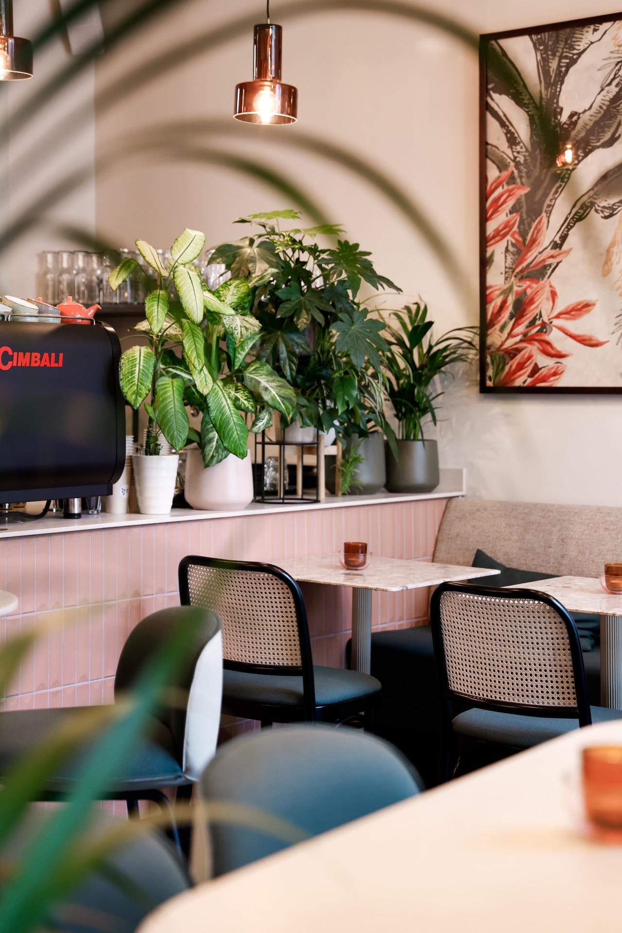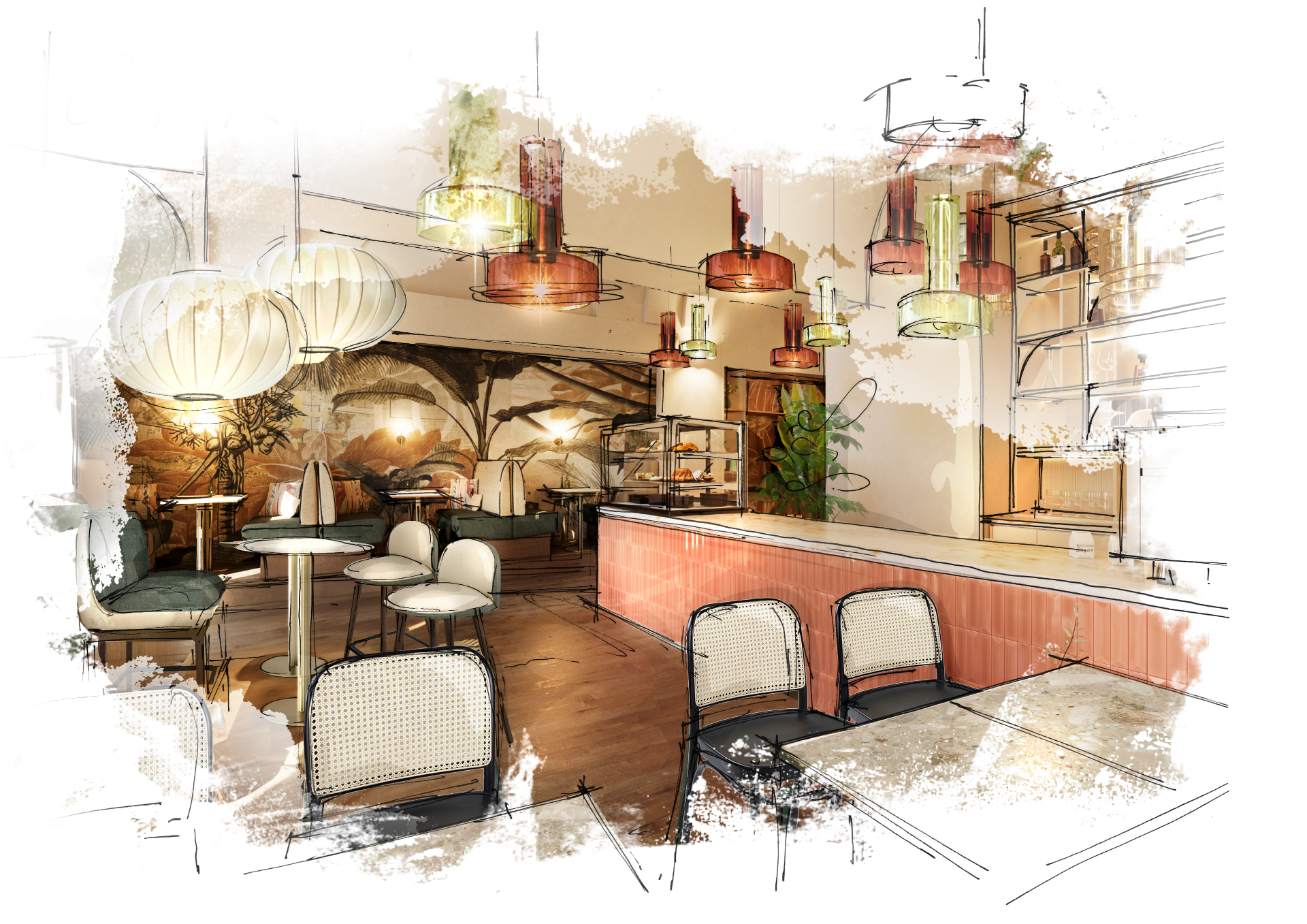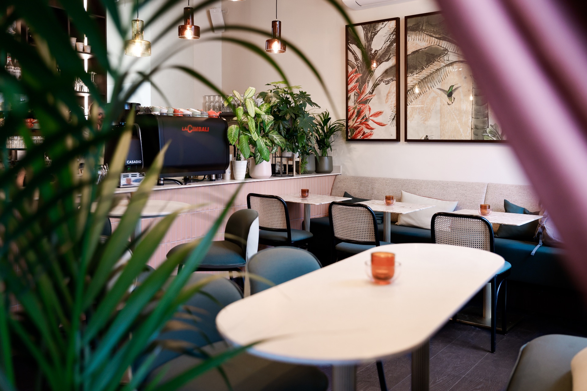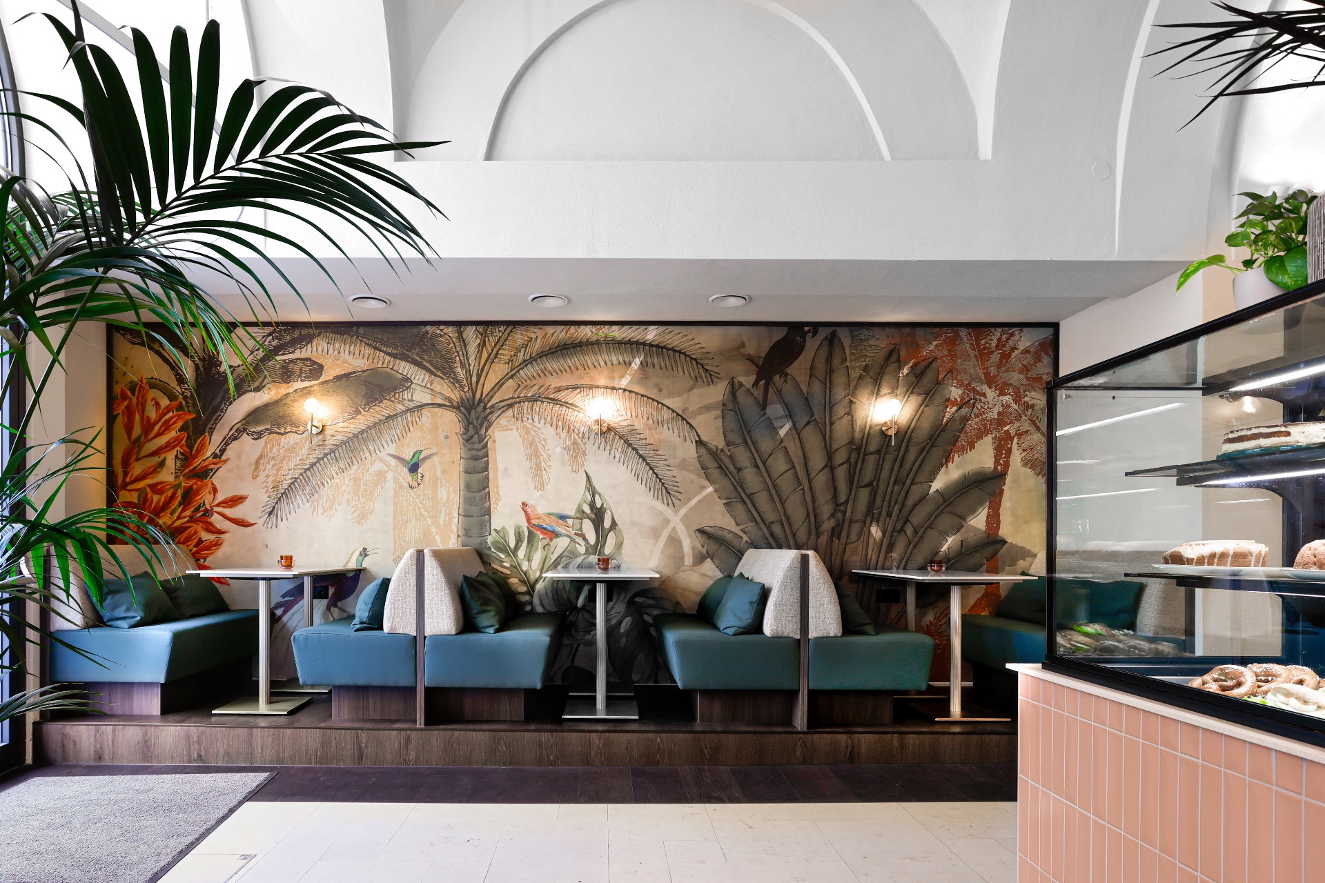 Inspiriert vom Sinnbild des „Garten Eden“ wurde ein urbaner Rückzugsort geschaffen: eine warme, einladende Farbwelt mit botanischen Motiven, organischen Formen und sanften Linien. Terrakotta- und Olivtöne prägen eine ruhige, geerdete Atmosphäre, die sich konsequent vom Café bis in die Zimmer zieht.