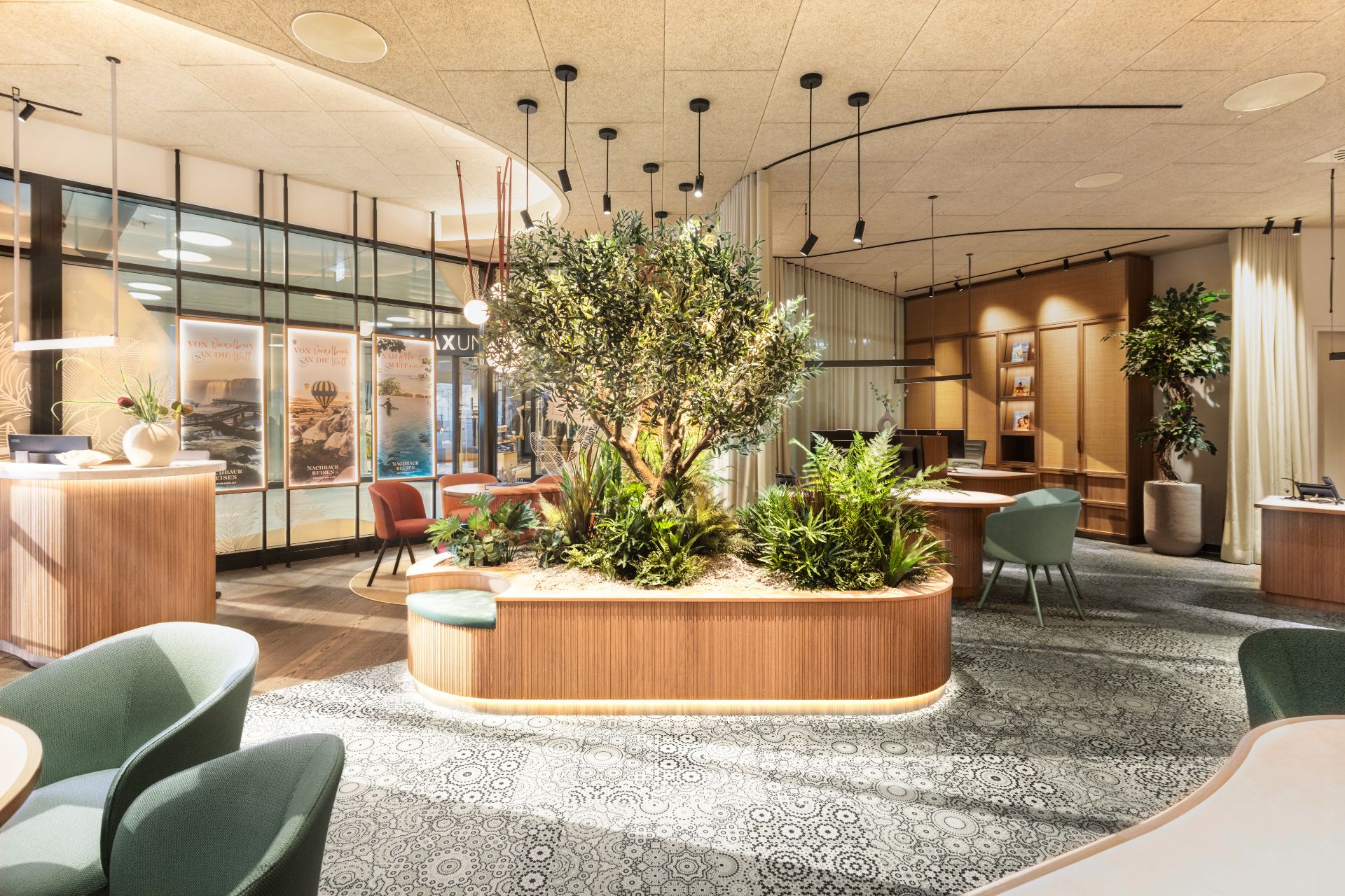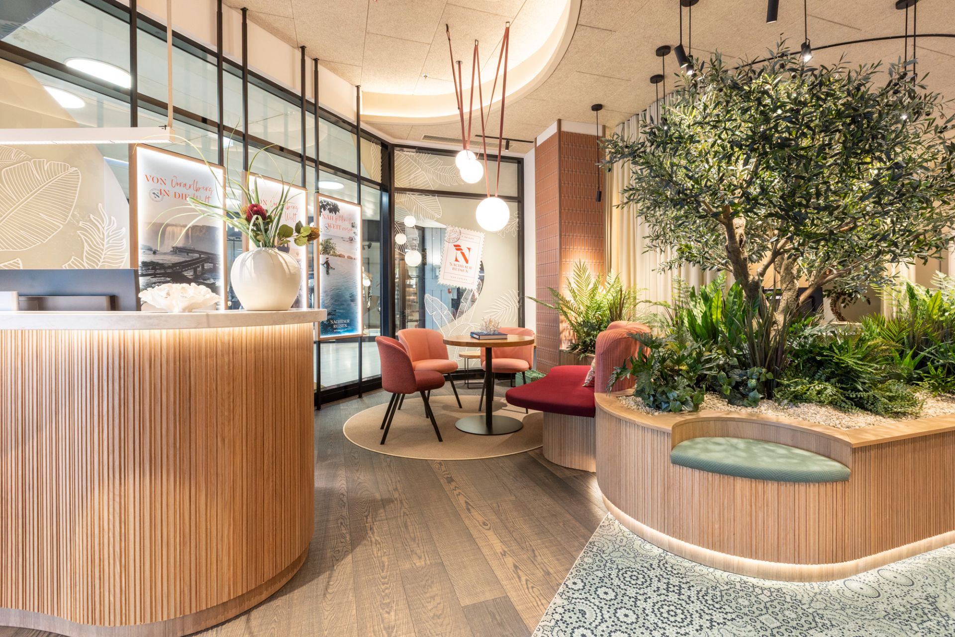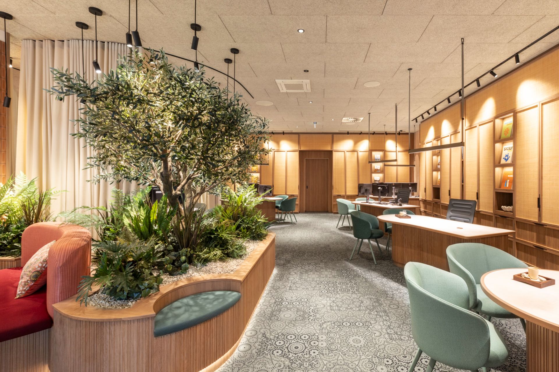 Zentrale Gestaltungselemente wie der bepflanzte Innenbereich, geschwungene Theken und akzentuierte Lichtführung sorgen für Struktur, ohne an Offenheit zu verlieren. Die Raumaufteilung bietet sowohl Rückzugsorte als auch Offenheit – perfekt abgestimmt auf unterschiedliche Kundentypen vom Individualreisenden bis zur Familie.
