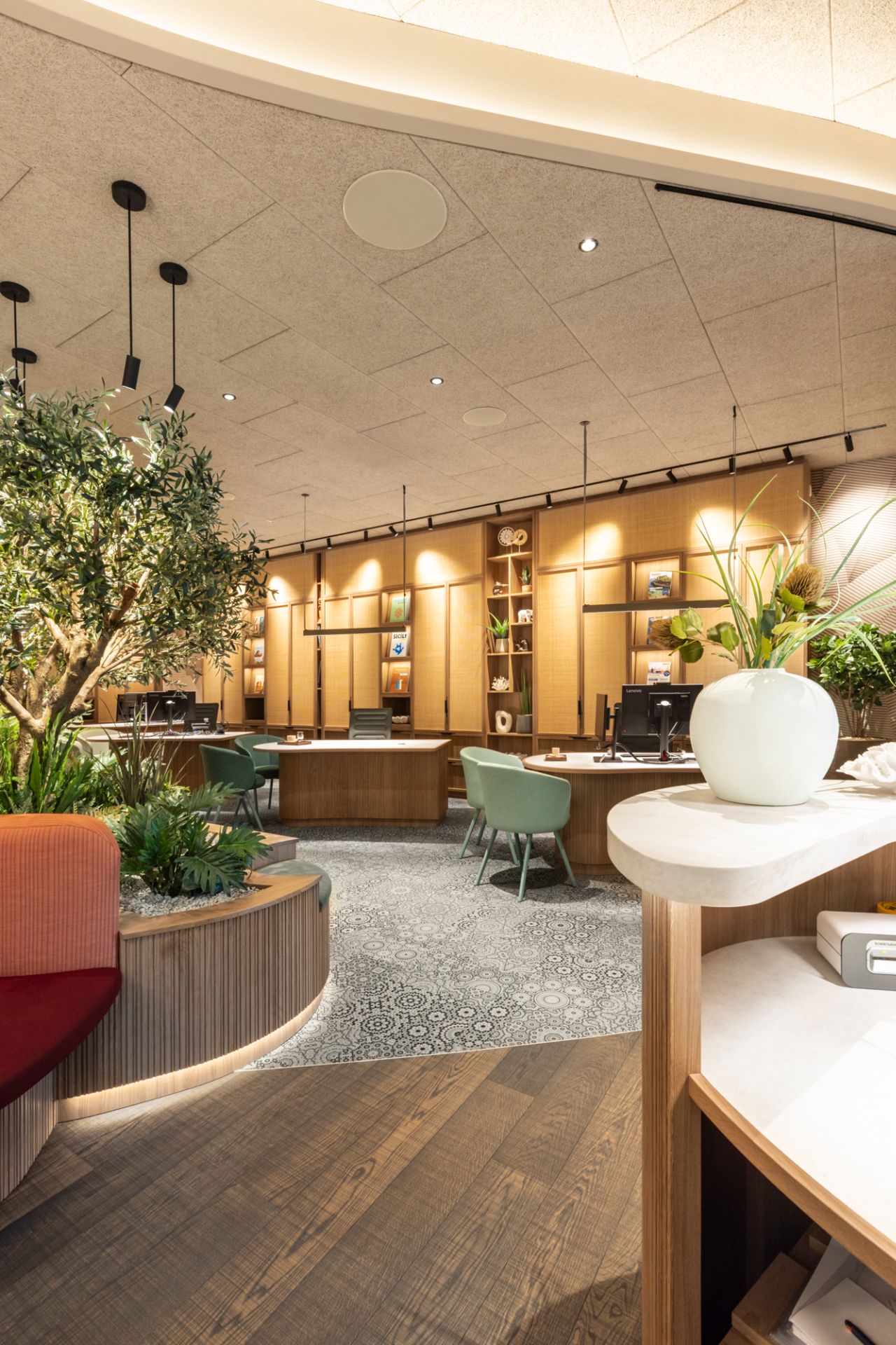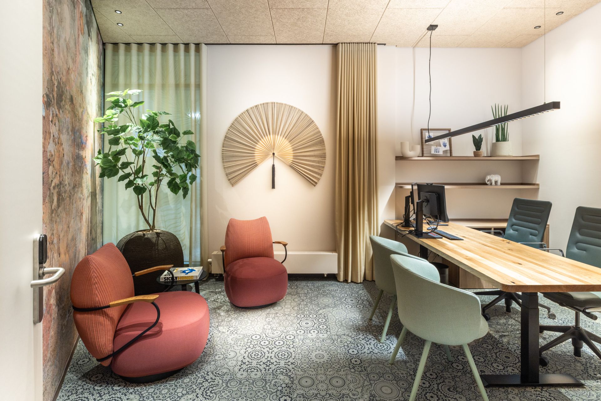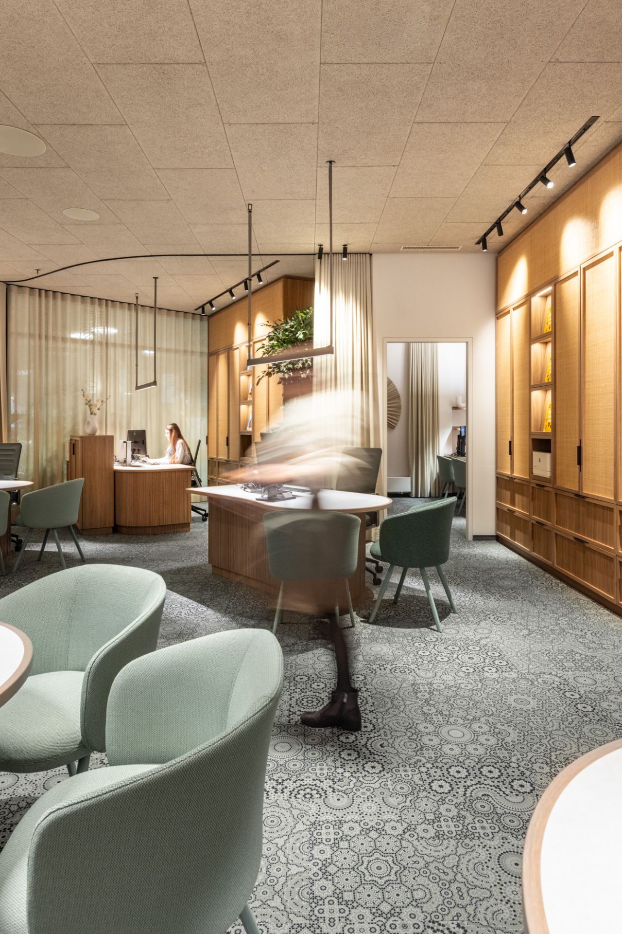 Das Interior Design orientiert sich an der Atmosphäre exklusiver Boutique Hotels – mit natürlichen Materialien, weichen Vorhängen, ausgewähltem Mobiliar und viel Grün. Die Kombination aus Holz, Textilien und warmem Licht schafft eine einladende Umgebung, in der sich Beratung und Entspannung auf Augenhöhe begegnen.
