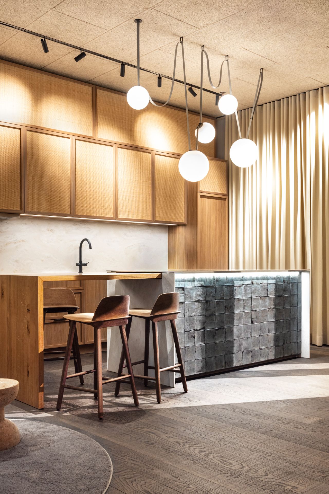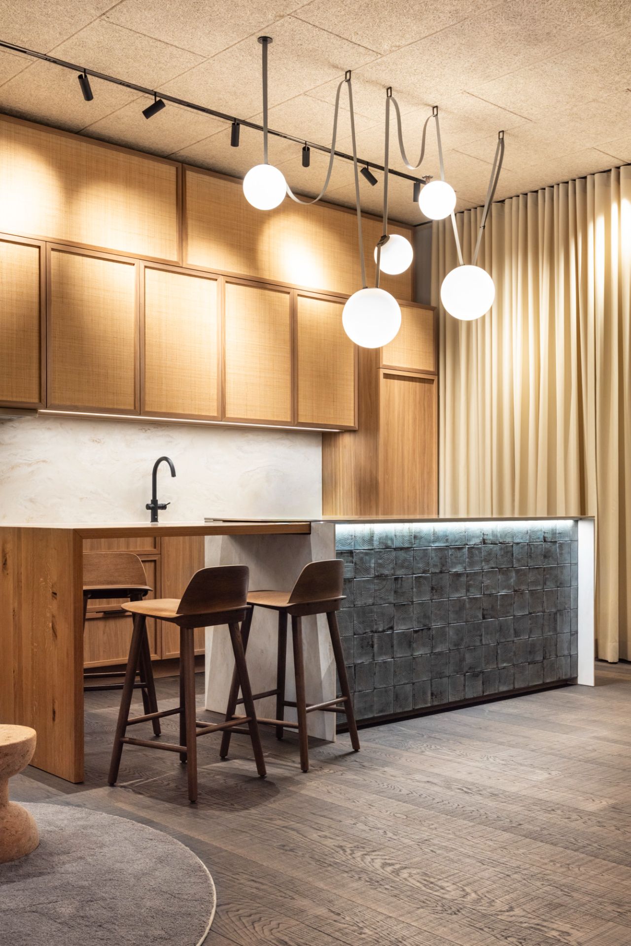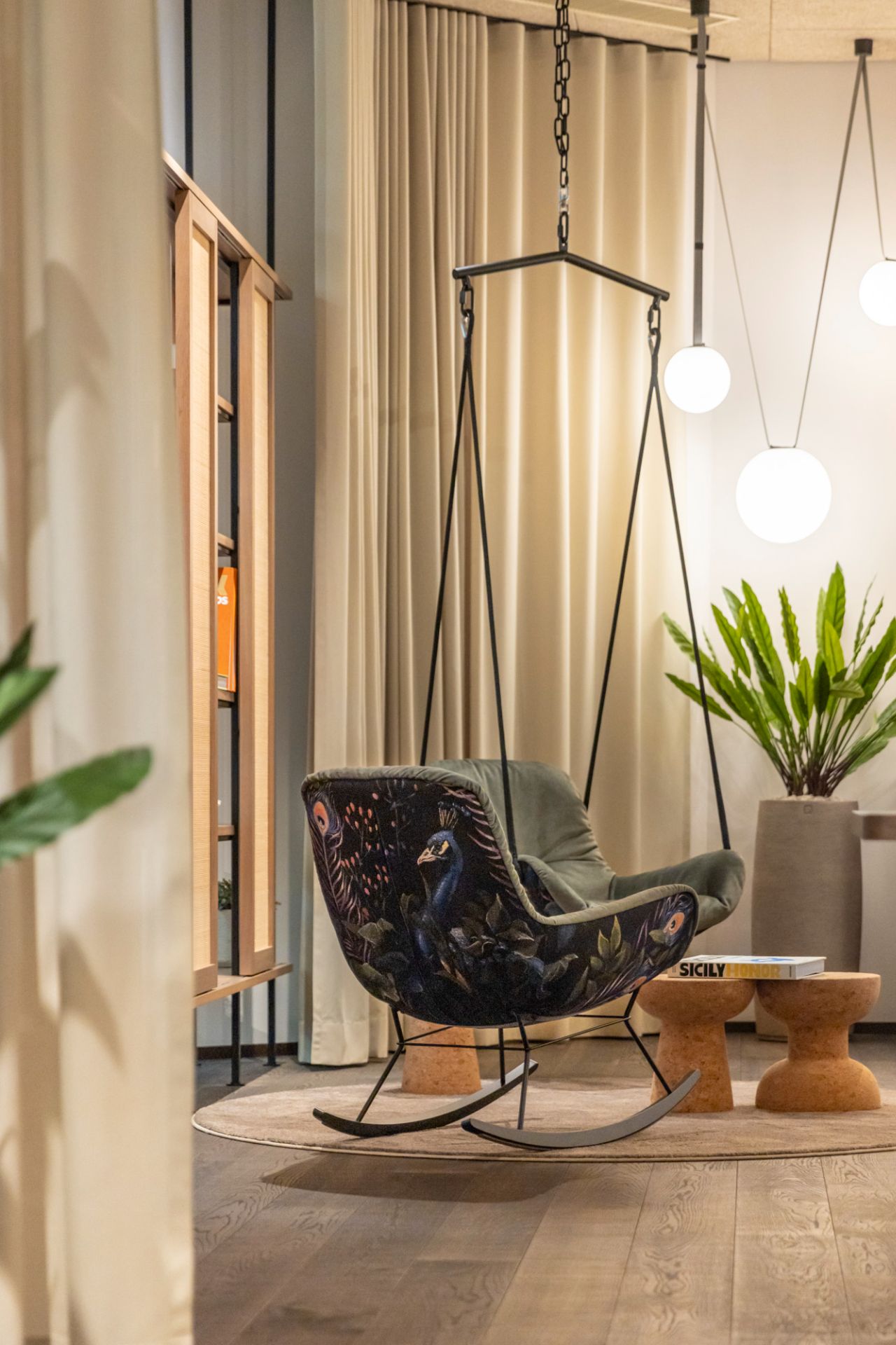 Das Interior Design orientiert sich an der Atmosphäre exklusiver Boutique Hotels – mit natürlichen Materialien, weichen Vorhängen, ausgewähltem Mobiliar und viel Grün. Die Kombination aus Holz, Textilien und warmem Licht schafft eine einladende Umgebung, in der sich Beratung und Entspannung auf Augenhöhe begegnen.