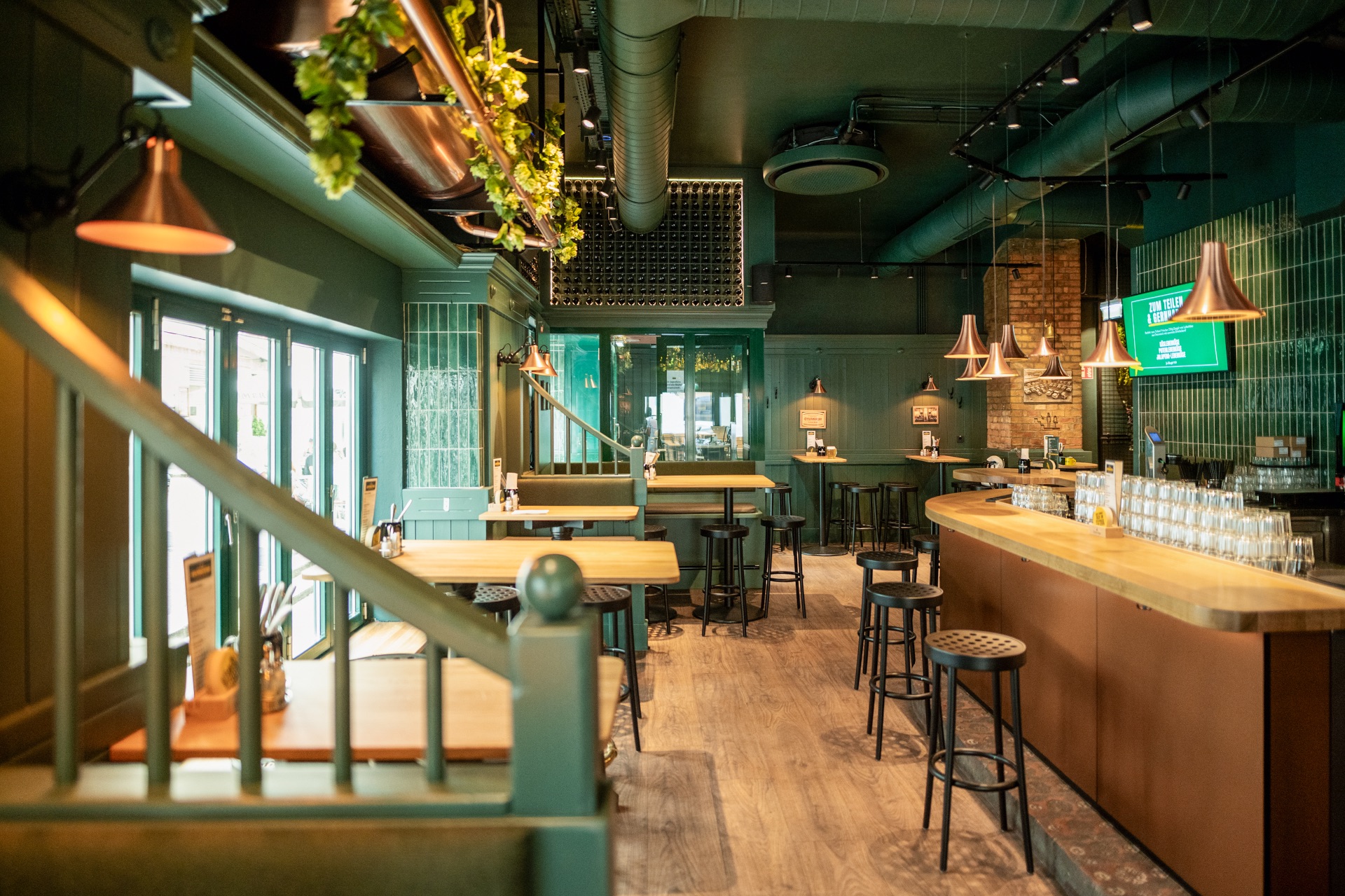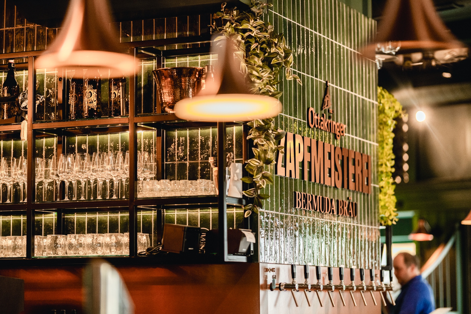 Im Zentrum: das Thema Bier – sichtbar gemacht durch ein Kronleuchter-Element aus Bierflaschen, kupferfarbene Zapfhähne vor grün glasierten Fliesen und dekorative Hopfendekorationen.