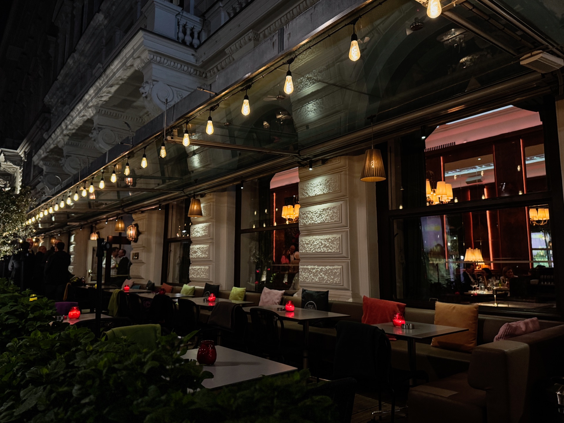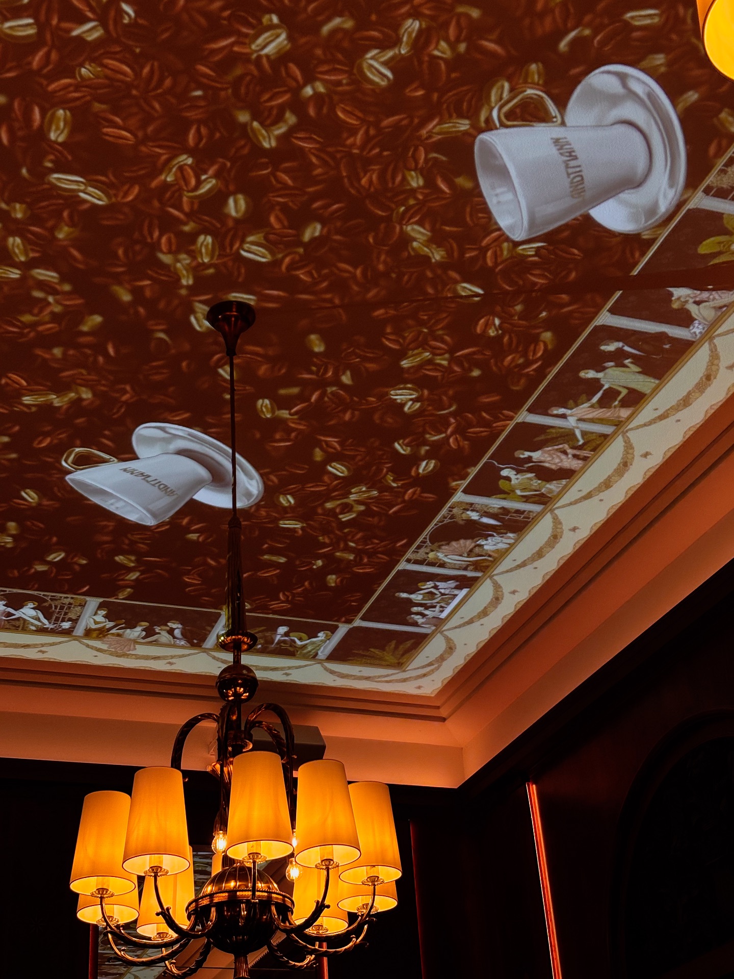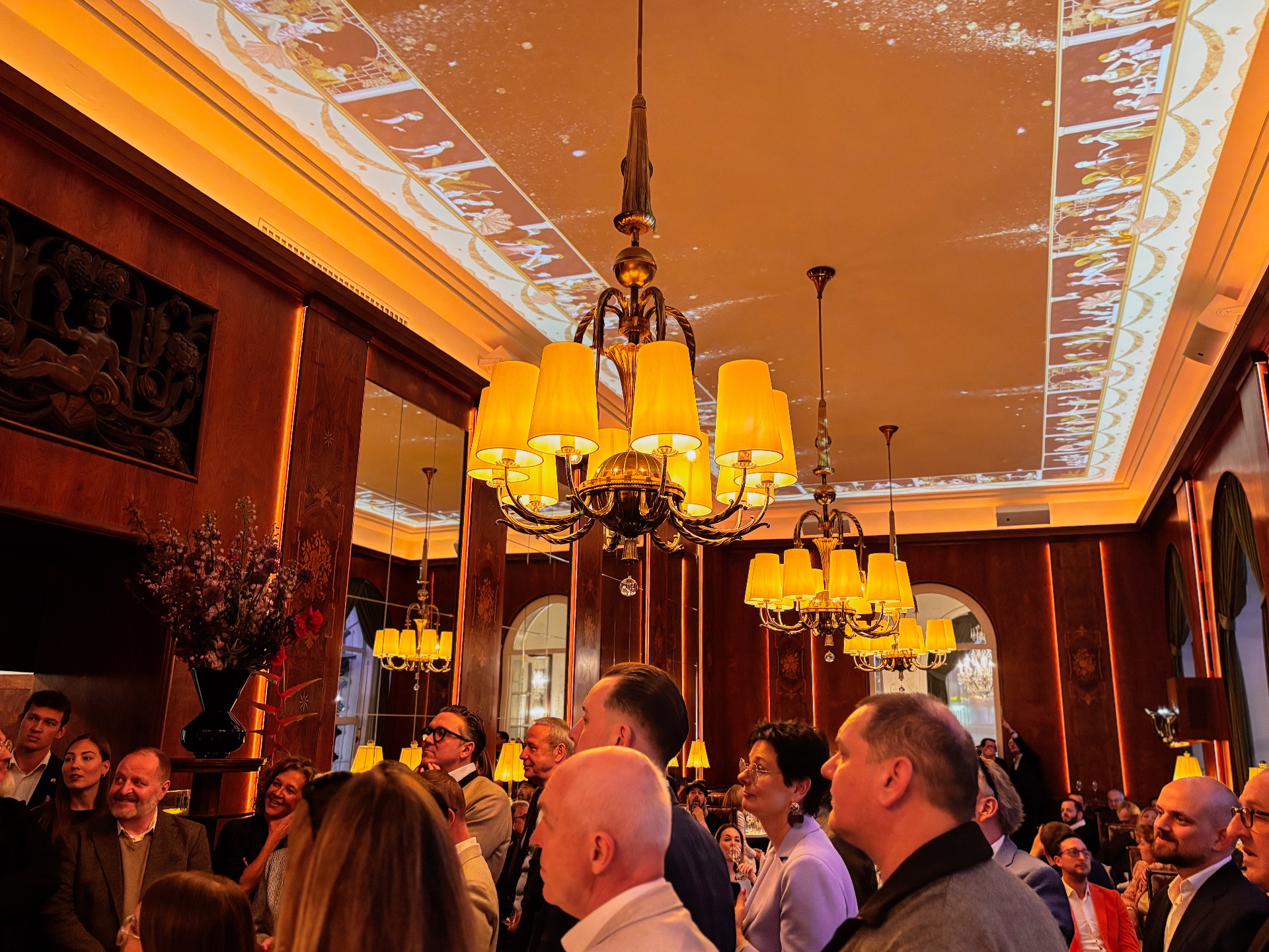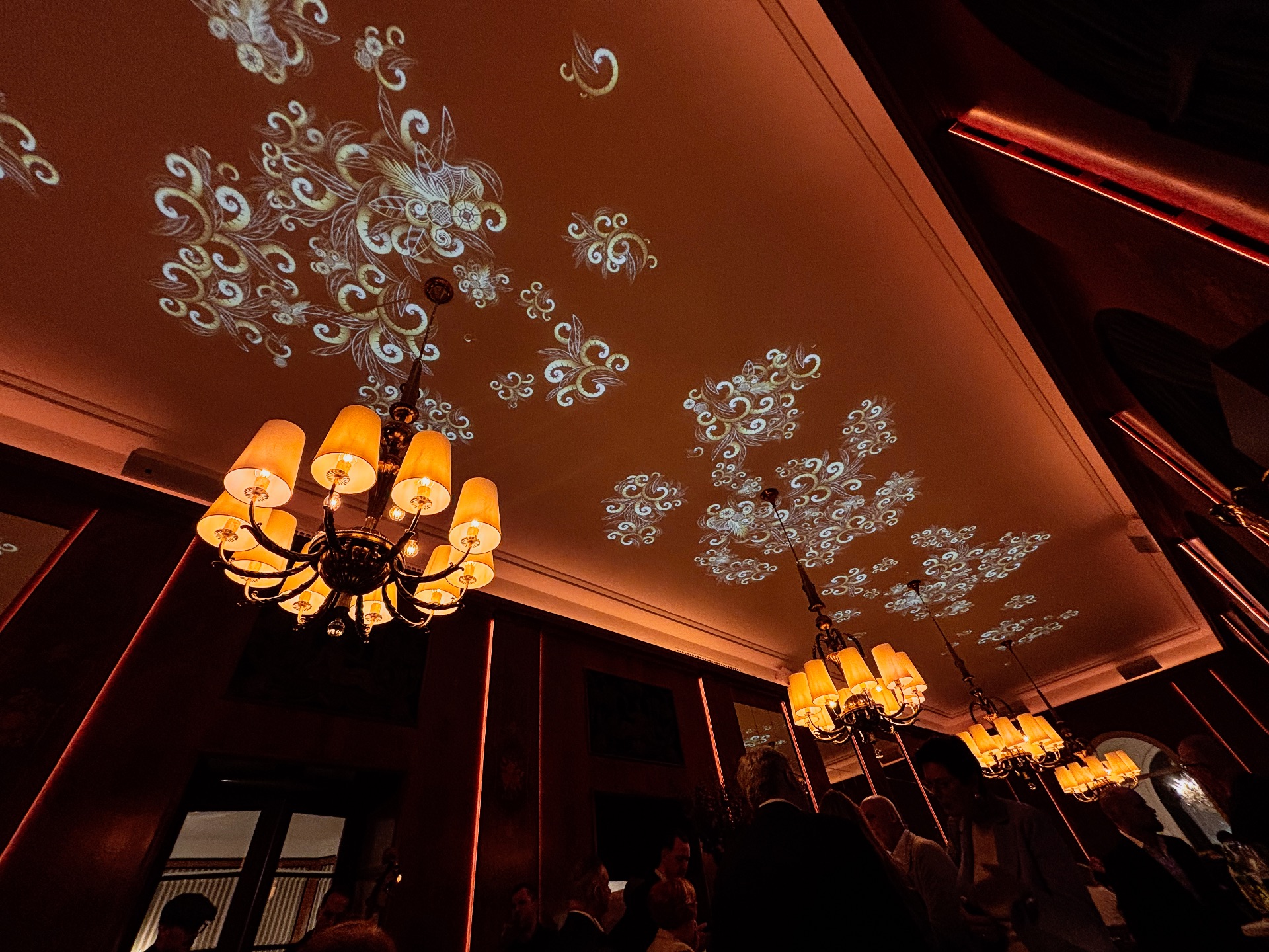 Die Antwort heißt Café Landtmann bei Nacht. Das Konzept: Tagsüber bleibt der Saal, was er ist -klassisch, ruhig, historisch. Ab 18 Uhr beginnt eine zweite Ebene. Der historische Saal wurde mit 4K-UHD-Laserprojektoren ausgestattet, die bewegte Bilder im Art-Déco-Stil an die Decke projizieren und die Atmosphäre im Raum verändern. Keine Eingriffe in die Substanz. Eine Deckengestaltung, die nur dann zum Vorschein tritt, wenn die Dunkelheit anbricht.