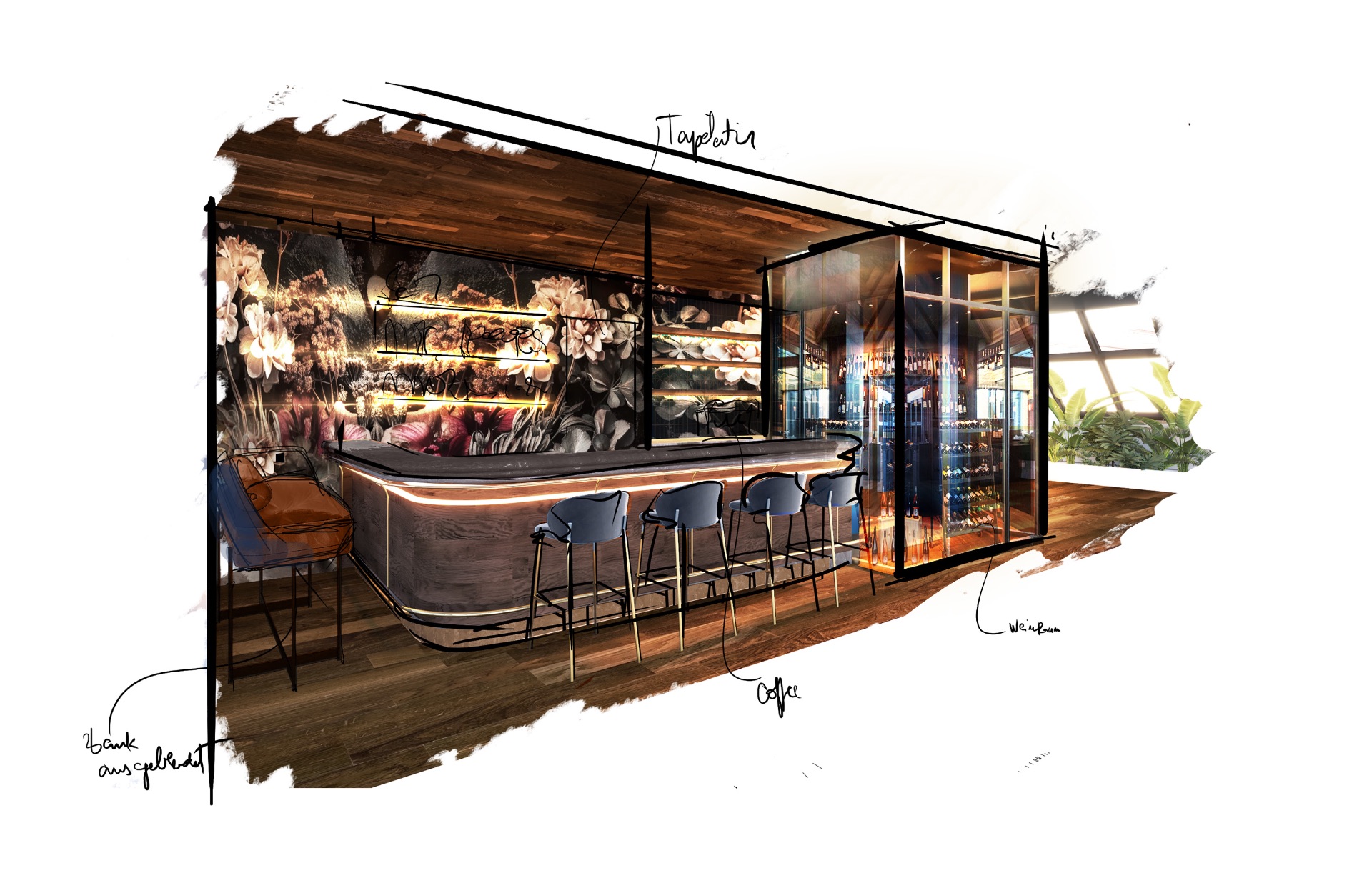 Ein zentrales Element des neuen Hotelkonzepts ist die Frühstücksbar in der obersten geschlossenen Ebene. Auf eine klassische Rezeption wurde bewusst verzichtet. Stattdessen übernimmt die Bar mehrere Funktionen: Sie fungiert als Ankunftsbereich, als Frühstückszone mit Sichtküche und als Weinbar am Abend.