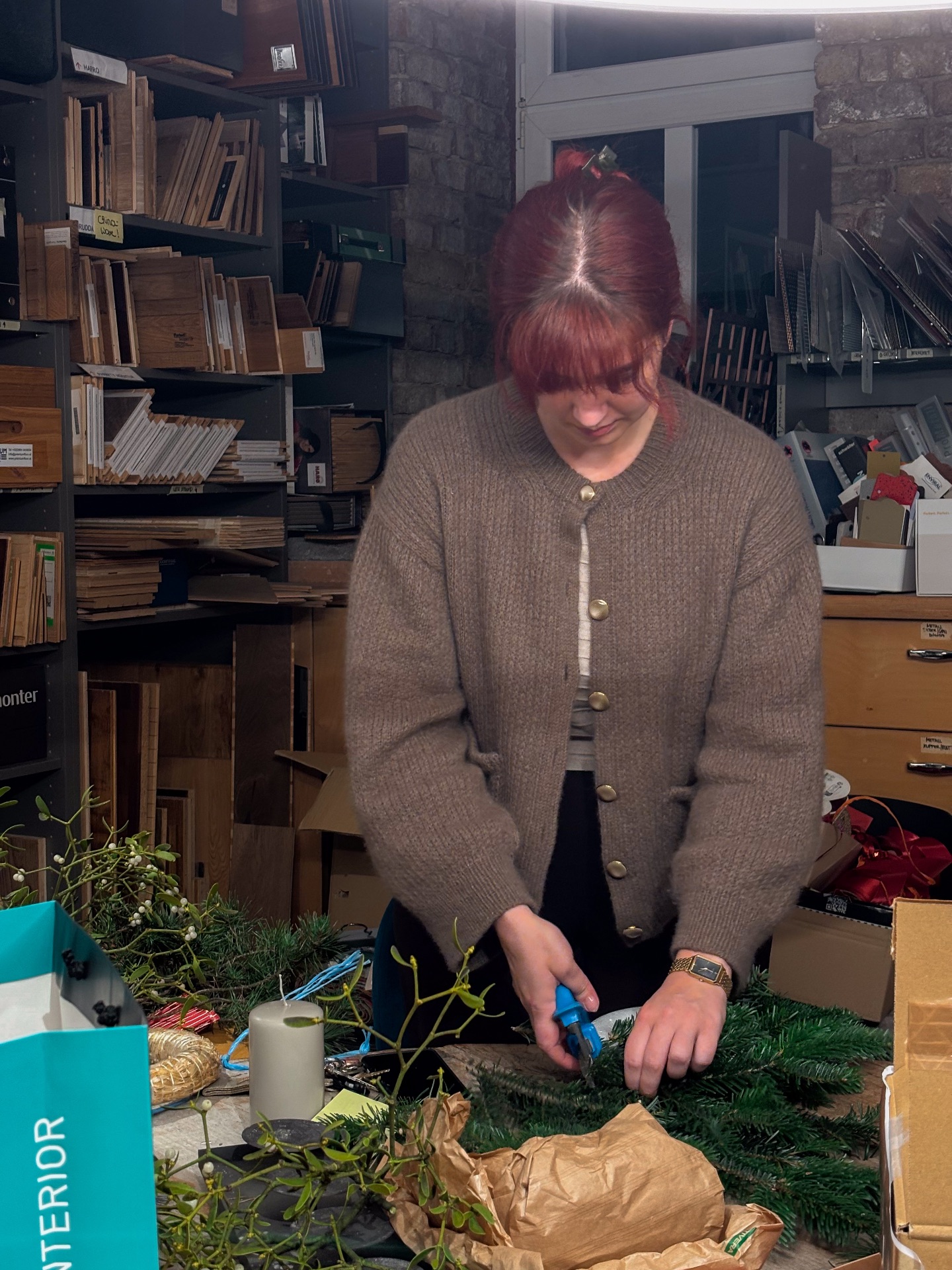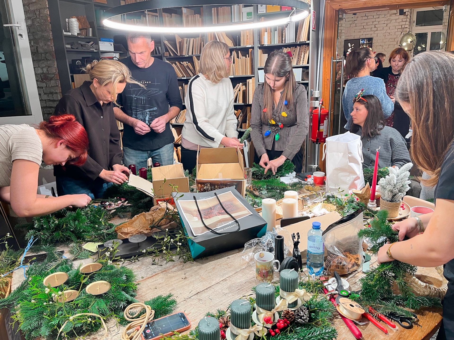 Überall wurde gebunden, gesteckt, gelacht und festlich dekoriert. So viele aus unserem Team waren um die Tische versammelt – Momente, die zeigen, dass Kreativität und Handwerk nicht nur unser Beruf, sondern auch ein gemeinsamer Herzschlag ist. Die Ergebnisse konnten sich sehen lassen: von klassisch-eleganten Kränzen bis zu mutigen, modernen Arrangements, die fast zu schade wären, um sie nur vier Wochen im Jahr anzuschauen.